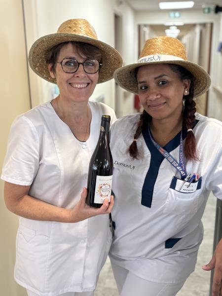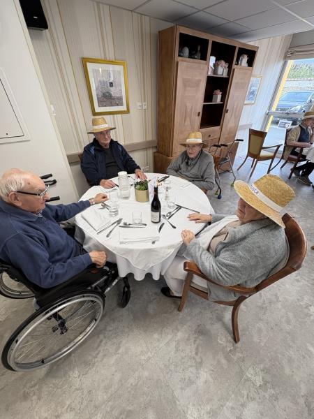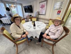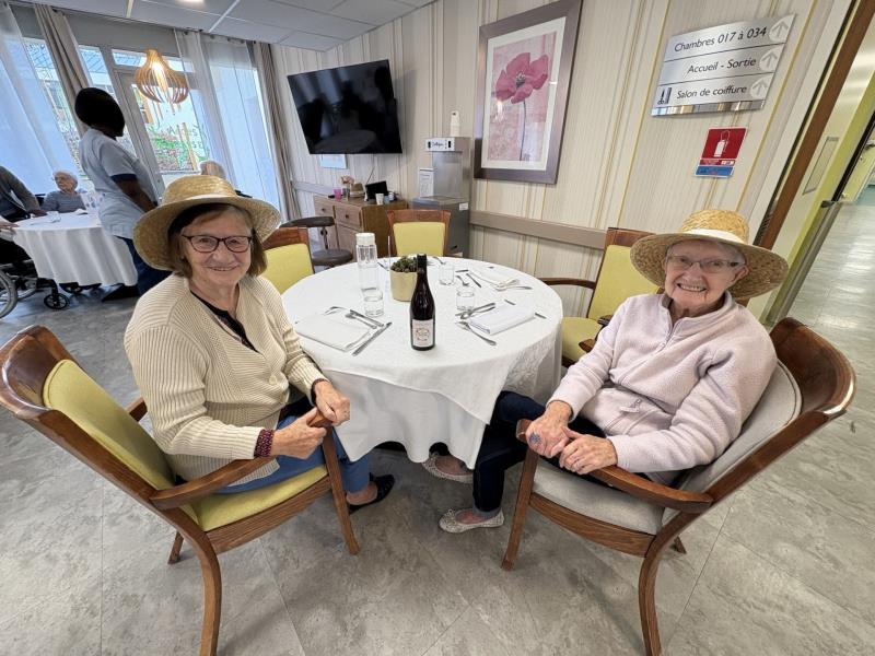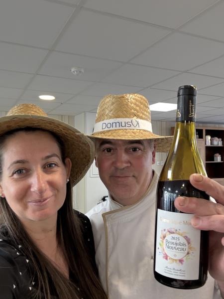 L'ambiance était tout aussi festive que le repas, car plusieurs résidents et membres de l'équipe ont joué le jeu en portant des chapeaux de paille. Cela a vraiment ajouté une touche d'authenticité et de convivialité à notre célébration. Et parlons du Beaujolais de cette année ! Il avait un goût surprenant et unique de banane selon les résidents, ce qui a certainement éveillé la curiosité de chacun.